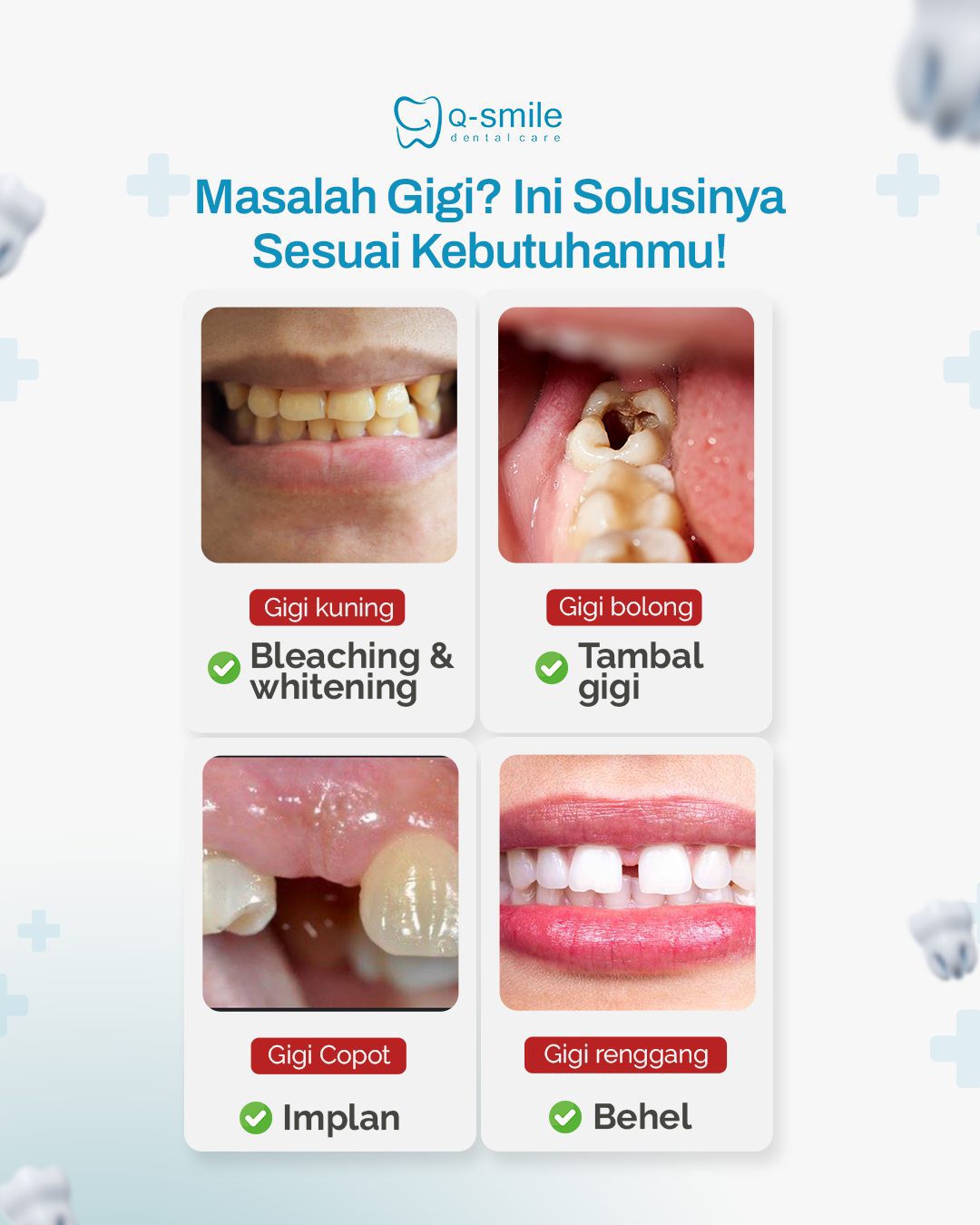 Apapun masalah gigi yang Sobat Q-Smile hadapi, jangan ragu untuk datang dan berdiskusi dengan tim dokter kami. Kami siap membantu Anda menemukan solusi terbaik untuk senyum yang lebih percaya diri dan sehat.